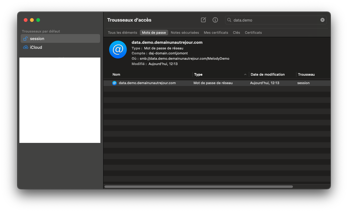 - Cliquer sur session dans la colonne de gauche puis rechercher le nom de domaine souhaité (exemple ici data.demo.demainunautrejour.com) via la barre de recherche en haut à droite