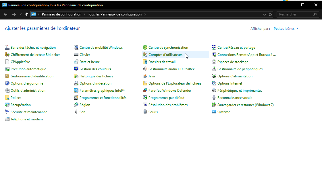 - Ensuite cliquer sur Comptes d’utilisateurs