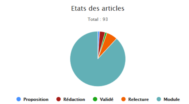 • Toutes les couleurs correspondent aux états définis dans le workflow, une légende permet de comprendre le travail restant à faire. Ici, un grand nombre d’articles issus de modèles de pages n’ont pas encore été pris.