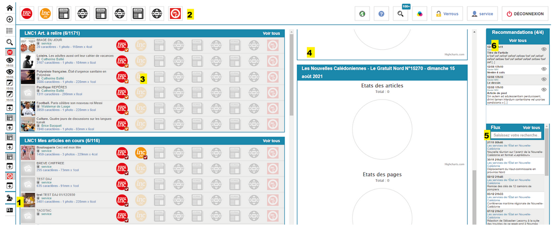 • Les diagrammes présentent l’état d’avancement de votre production par objets : les articles et les pages.