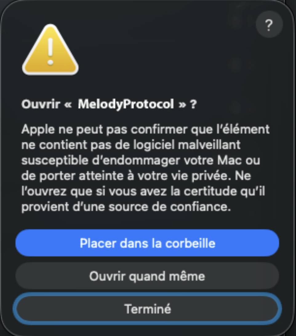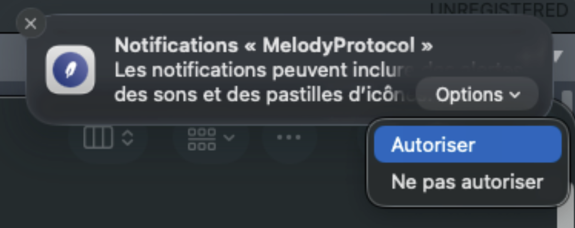 Le système Mac OS peut lui aussi bloquer l’application MelodyProtocol, pensez à autoriser MelodyProtocol dans les Réglages Système.