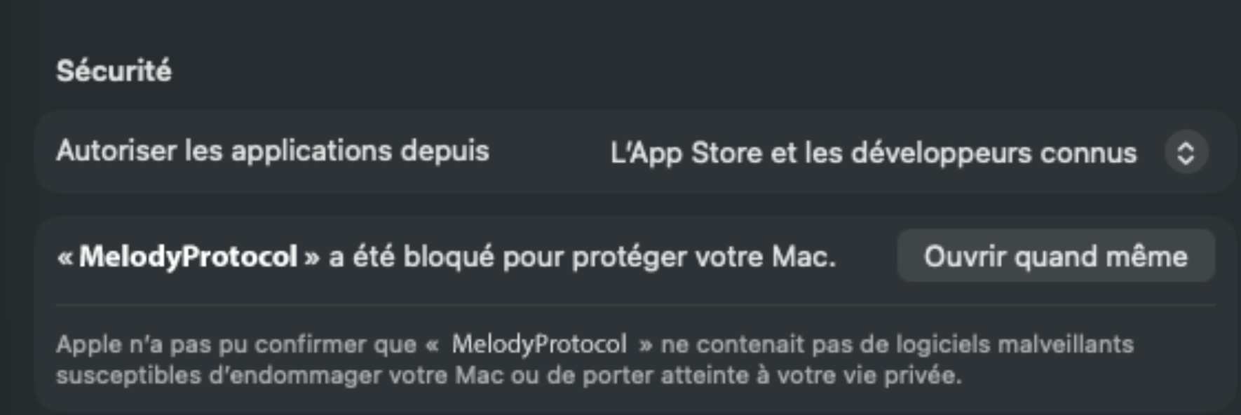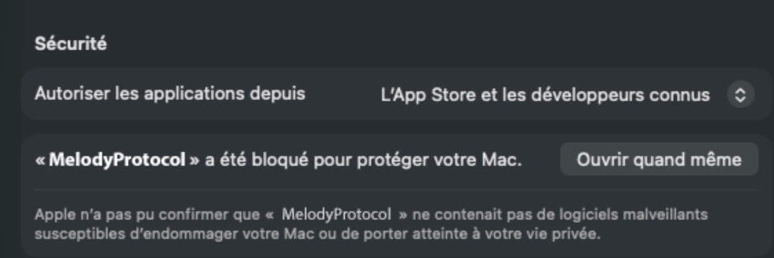 Afin de l’autoriser, il faut exécuter l’application MelodyProtocol depuis le dossier Application et ensuite aller dans l’application “Réglages Système”, allez dans l’onglet “Confidentialité et sécurité” et autorisez l’application à s’exécuter en bas de la page en cliquant sur Ouvrir quand même :