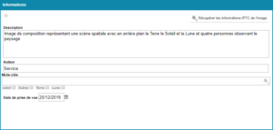 Si les informations IPTC sont renseignées dans l’image, telles que le titre, la description ou encore l’auteur, elles seront automatiquement importées dans les champs “Description” et “auteur”.