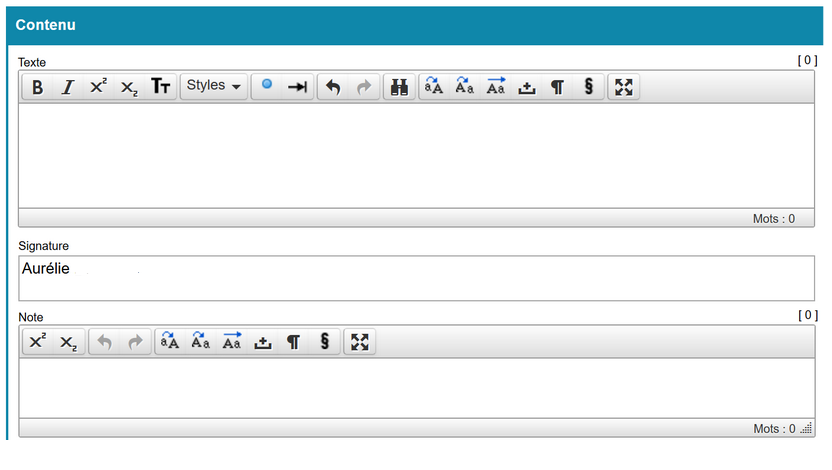 - La note : champ permettant de renseigner une information complémentaire utilisant une présentation différente ou identique au texte principal.