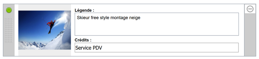 Le Rond vert indique la qualité de l’image en fonction de la dimension du bloc photo dans laquelle elle sera intégrée. La couleur peut passer au orange indiquant que l’image est d’une qualité médiocre, et au rouge lorsqu’elle n’est pas de qualité suffisante.