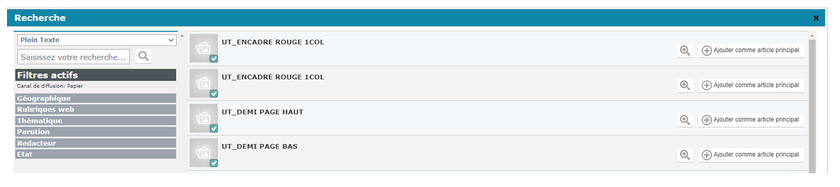 En cliquant sur le bouton “Ajouter un article existant comme article principal” une fenêtre de recherche s’affiche, permettant de rechercher l’article souhaité afin de le lier à l’article en cours. Des filtres de recherches ainsi que l’aperçu de l’article offrent toutes les possibilités pour retrouver l’article concerné. Pour sélectionner l’article il suffit de cliquer sur “Ajouter comme article principal” puis sur “OK” en bas de la fenêtre.