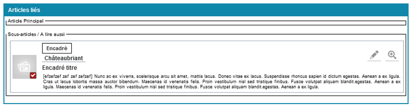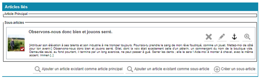 Il est possible de retirer l’article (le délier) en utilisant la croix, de l’éditer en cliquant sur le crayon ou, pour les articles Web, de l’ancrer dans le texte de l’article principal. La loupe permet d’afficher un aperçu de l’article.