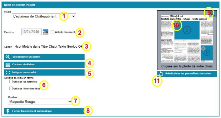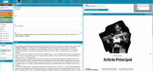 Cette page recense toutes les informations liées à la parution et à la mise en forme et présente – en vignette éditable – la construction du carton sélectionné. Dans l’exemple ci-dessus, il s’agit d’un carton de 2 colonnes comprenant une photo de 2 colonnes avec sa légende et son crédit. Cet article comprend : une information de localisation, un surtitre, un titre et un texte comprenant lui-même un intertitre, une signature et une note et enfin, une photo et sa légende.