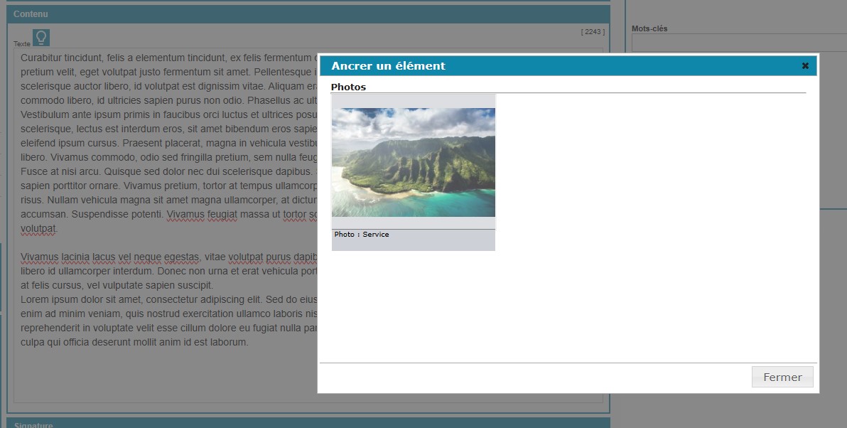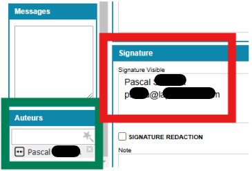 La signature est gérée via le champ “auteurs” ce qui permet à l’utilisateur d’avoir une signature longue par défaut et d’appliquer sa signature courte au besoin. Aussi il est possible de cumuler les auteurs.