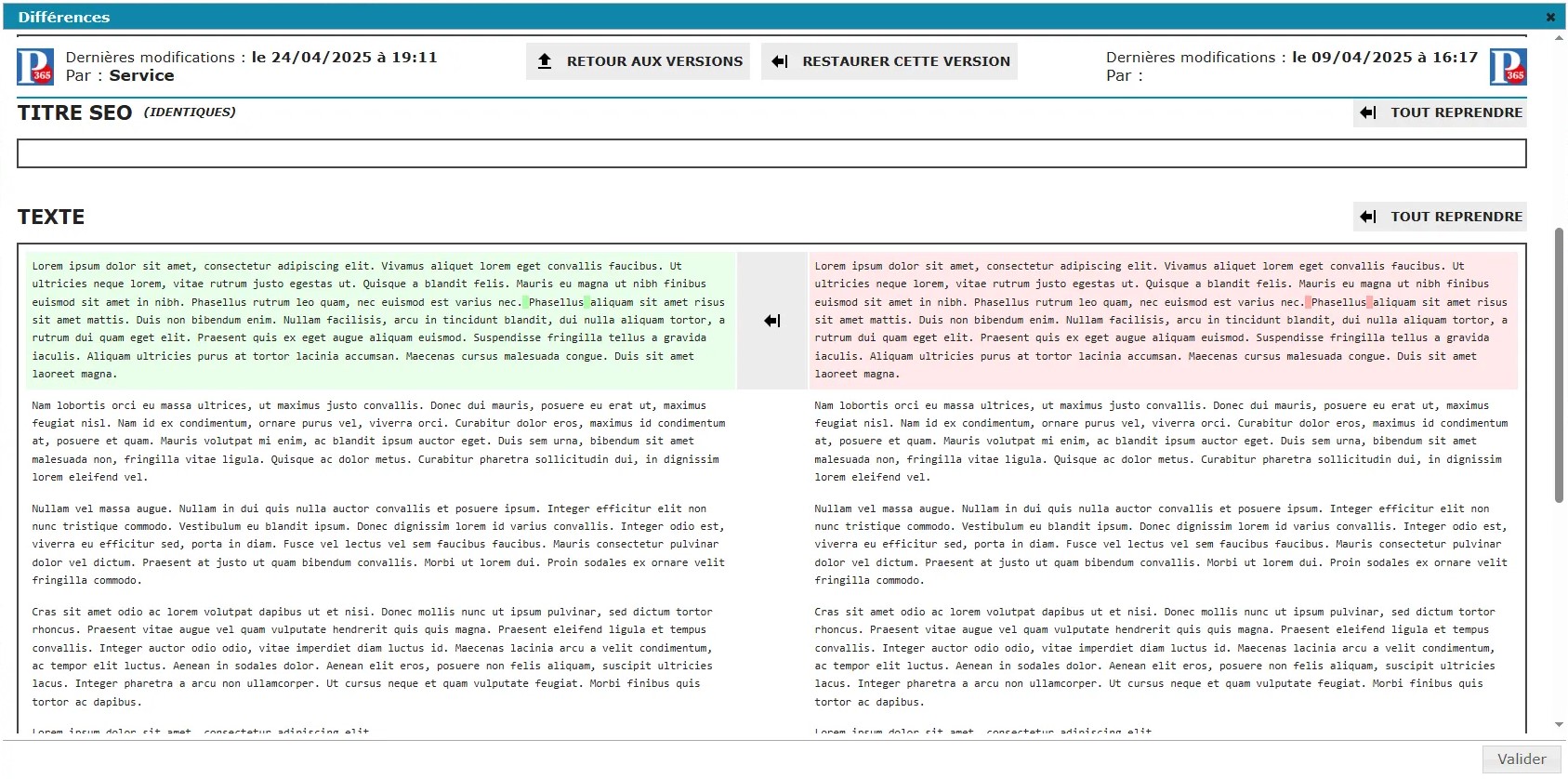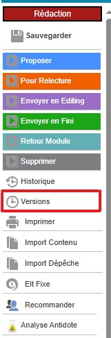 Ce bouton permet de voir la liste des versions enregistrées. Chaque ligne indique, la date et l’heure de la sauvegarde, le rédacteur ayant effectué le changement.