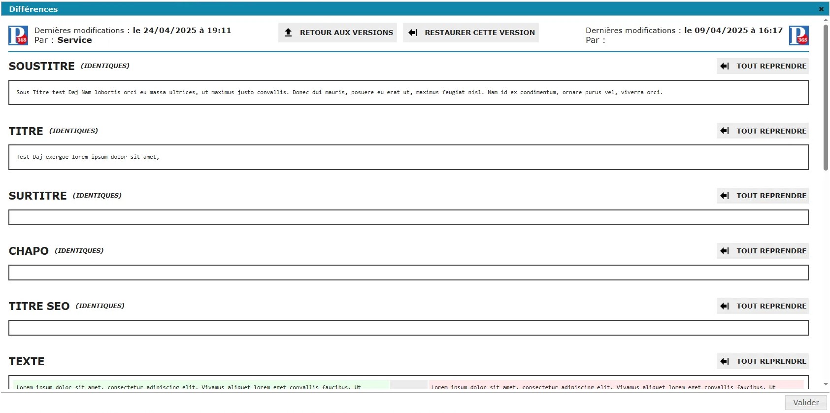 A l’aide de ce bouton, il est possible de comparer avec la version actuelle à l’aide de ce bouton